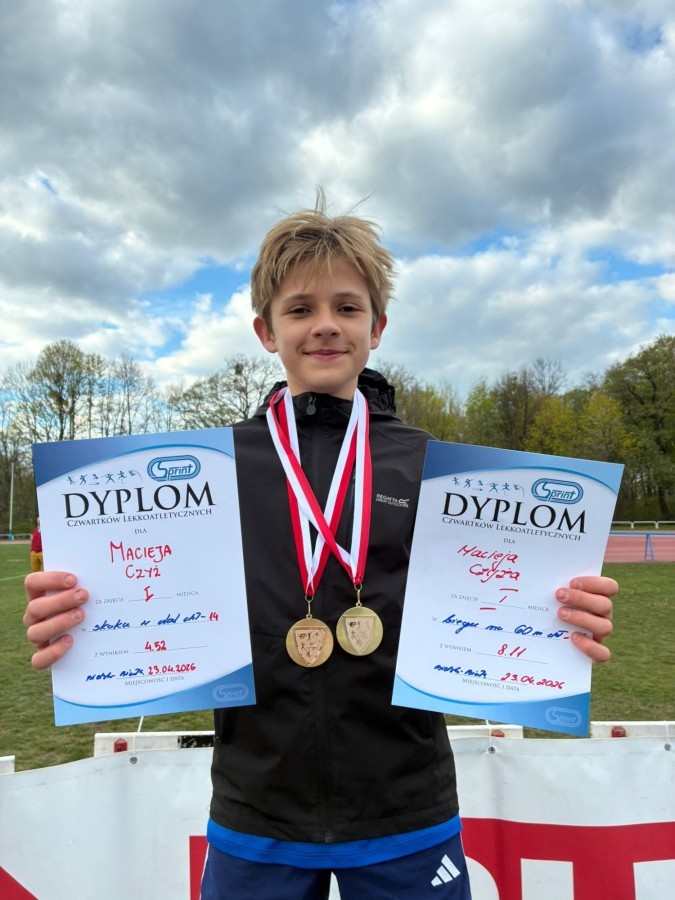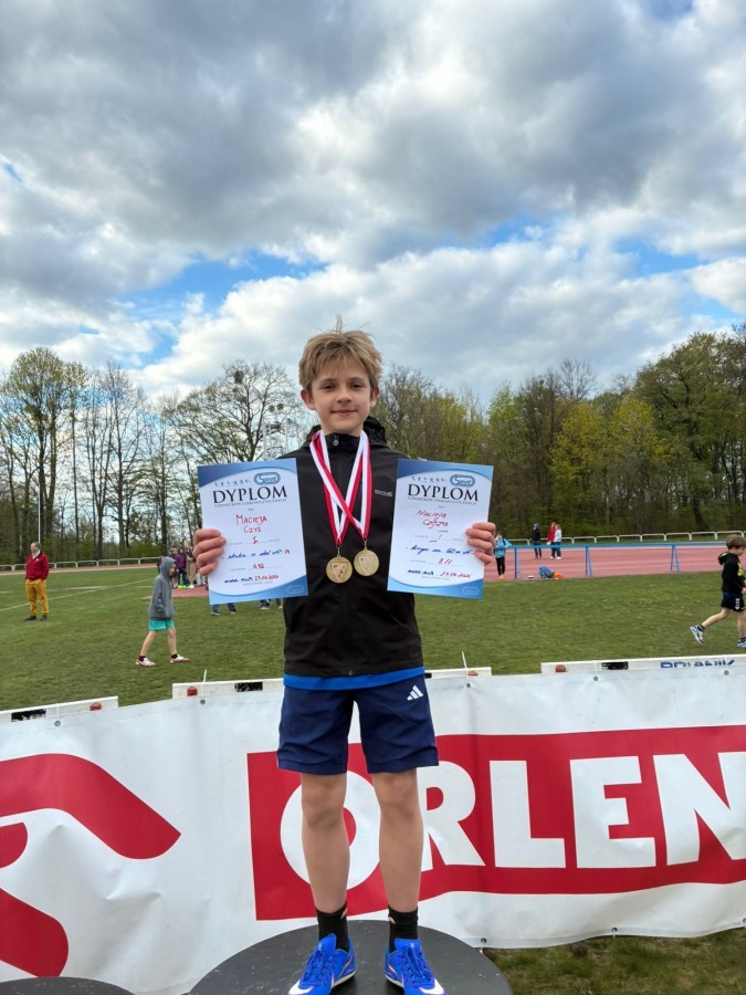 Miło nam się pochwalić, że w drugim wiosennym Czwartku /23.04/ Maciej CZYŻ - uczeń klasy 5 zdobył dwa złota w swoich konkurencjach - biegu na 60m oraz w skoku w dal. Maciej walczy o jak najlepszy wynik i miejsca by móc się zakwalifikować na Finał Ogólnopolski, który odbędzie się w Łodzi w czerwcu.
