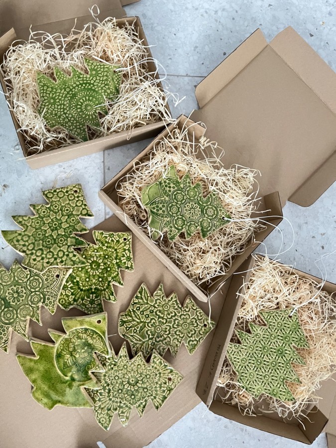 Uczniowie wykonywali płaską formę ceramiczną – choinkę, wykorzystując różnorodne wzory i faktury. Prace zostały dwukrotnie wypalone oraz poszkliwione przez nauczyciela, a następnie zapakowane w estetyczne pudełka z siankiem.
