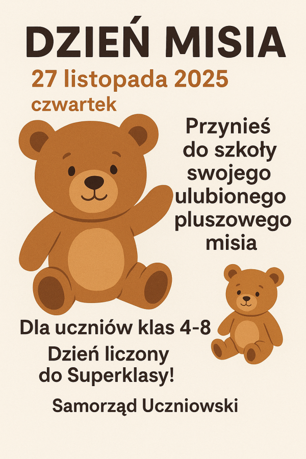 Tego dnia pluszowi towarzysze odwiedzili szkołę, a ich liczba została doliczona do punktacji w konkursie „Superklasa”. Uczniowie z klas 4–6 oraz 7–8 zgłaszali liczbę misiów odpowiednim przedstawicielkom SU.