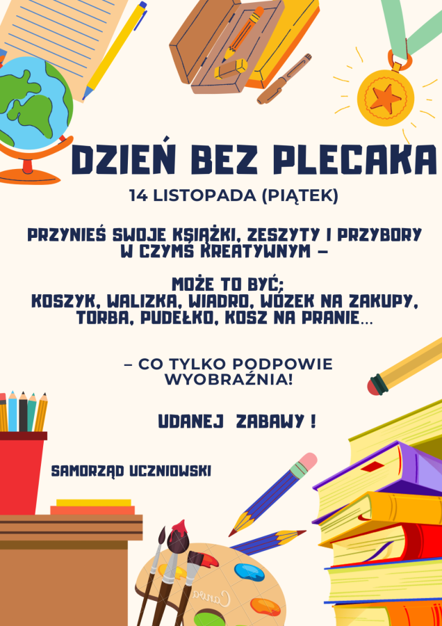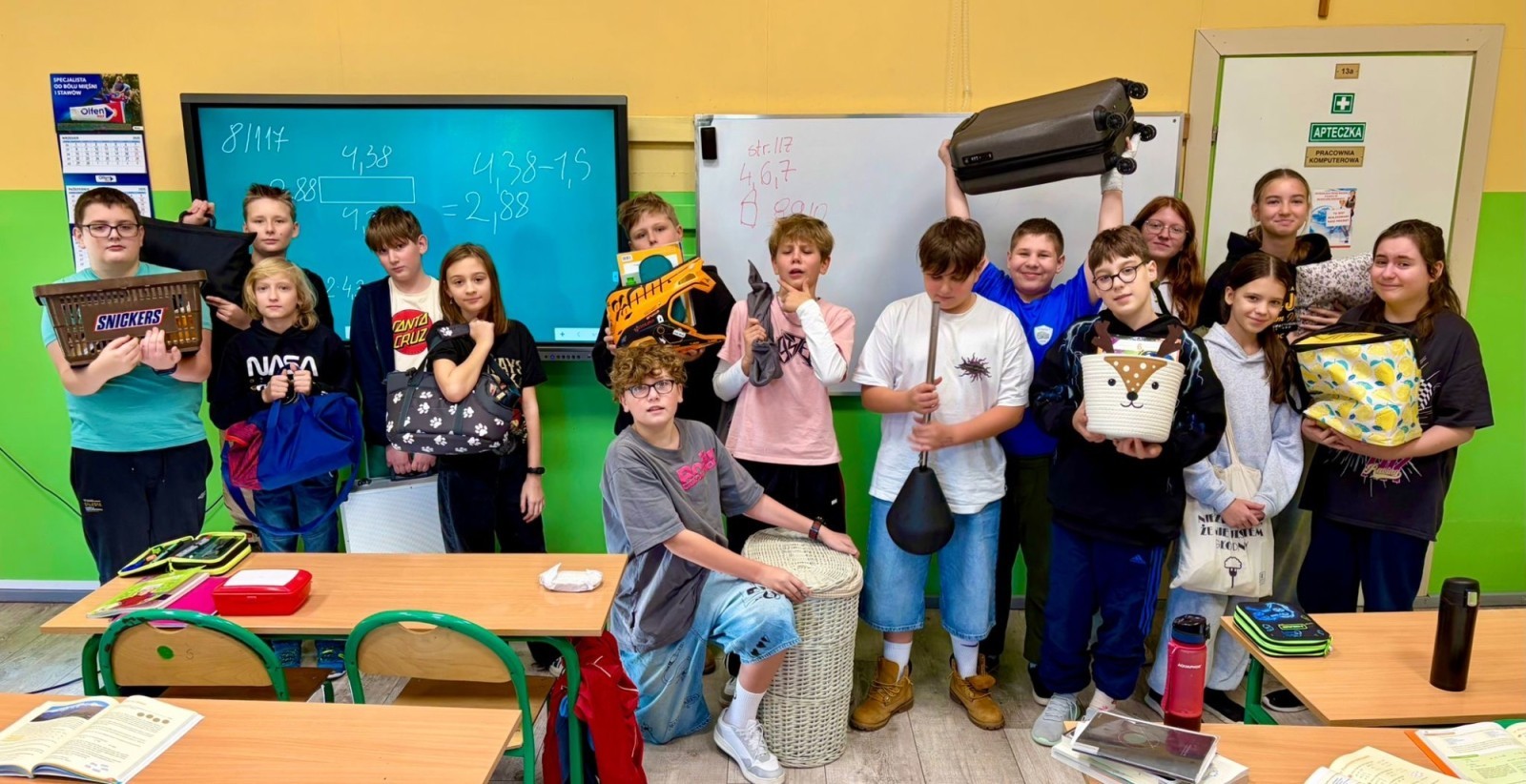 14 listopada zorganizowaliśmy radosną akcję „Dzień bez plecaka”. Uczniowie wykazali się ogromną pomysłowością, przynosząc książki i przybory szkolne w najbardziej nietypowych „zamiennikach” plecaków – od koszyków, walizek i wózków sklepowych, po wiadra czy kosze na pranie.