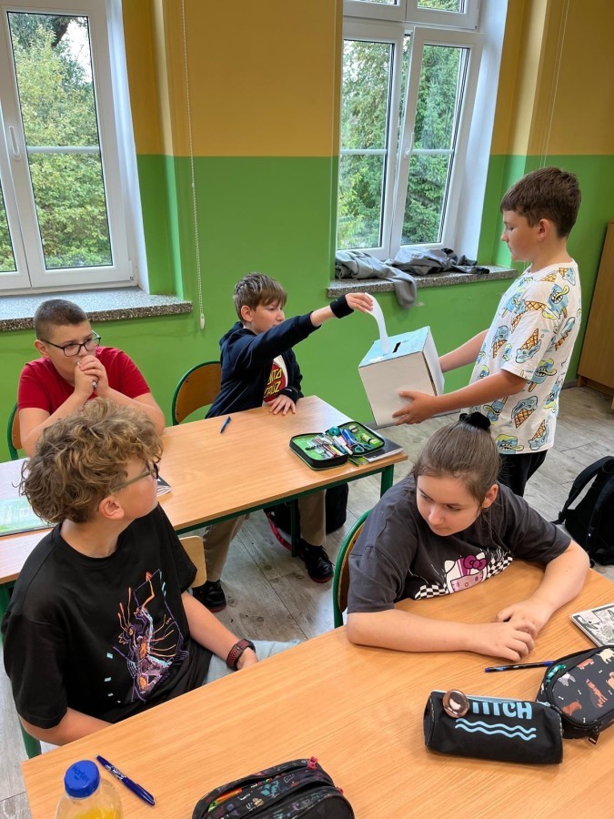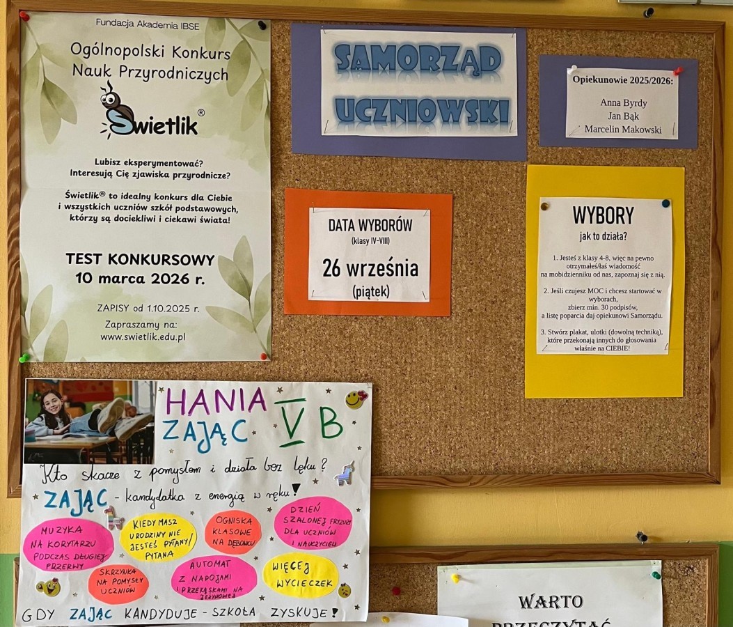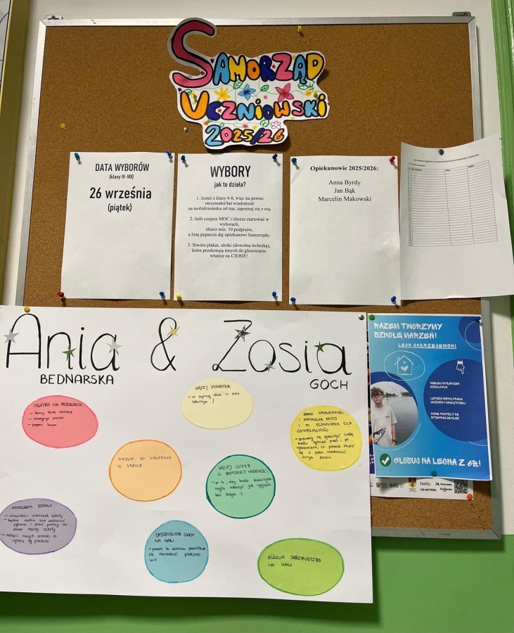 Wrzesień rozpoczęliśmy od opracowania planu pracy samorządu i ogłoszenia wyborów do nowych władz SU. Kandydaci zbierali podpisy poparcia i prezentowali swoje pomysły na gazetkach szkolnych. Finałem były wybory, w których wyłoniono przewodniczące Annę Bednarską i Zofię Goch z kl. 8b oraz wiceprzewodniczącą Hannę Zając z kl. 5b.