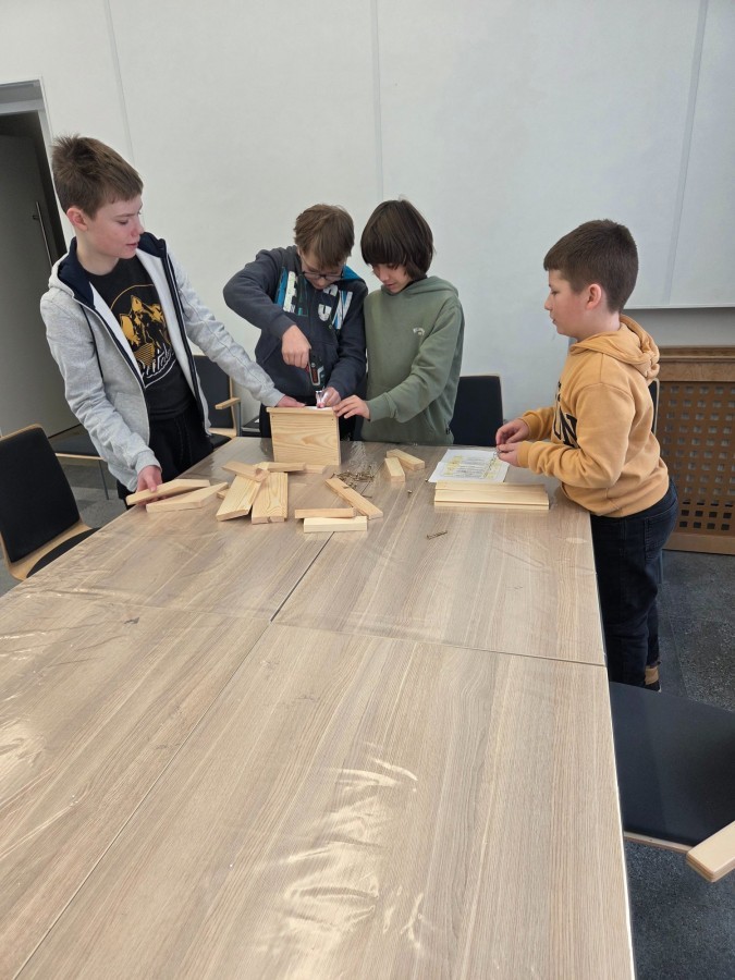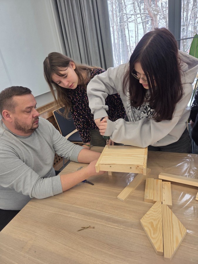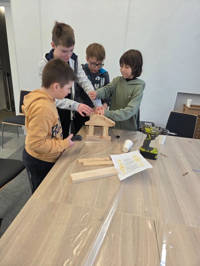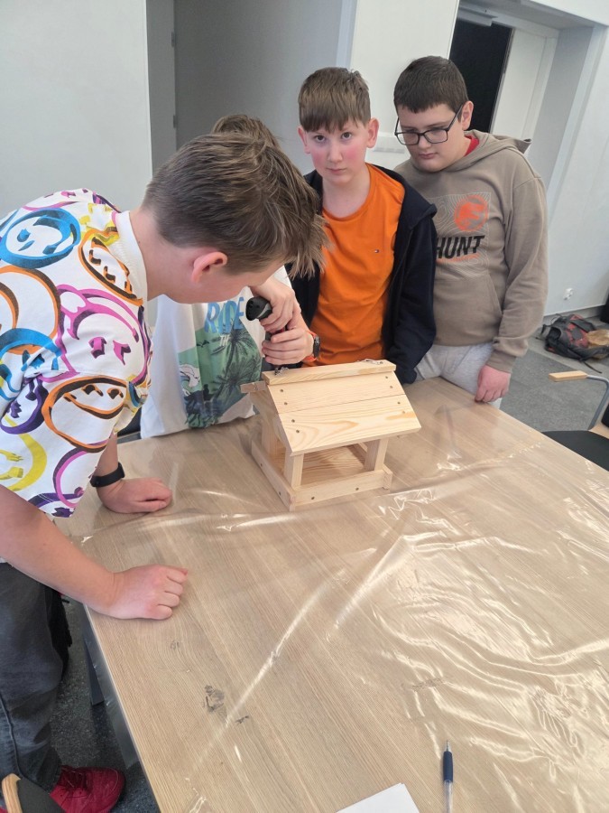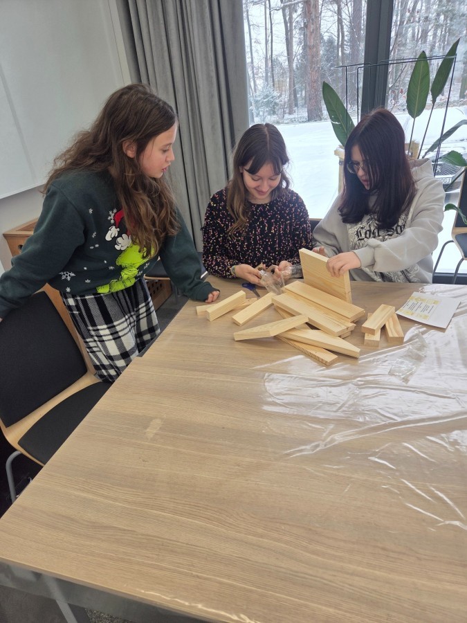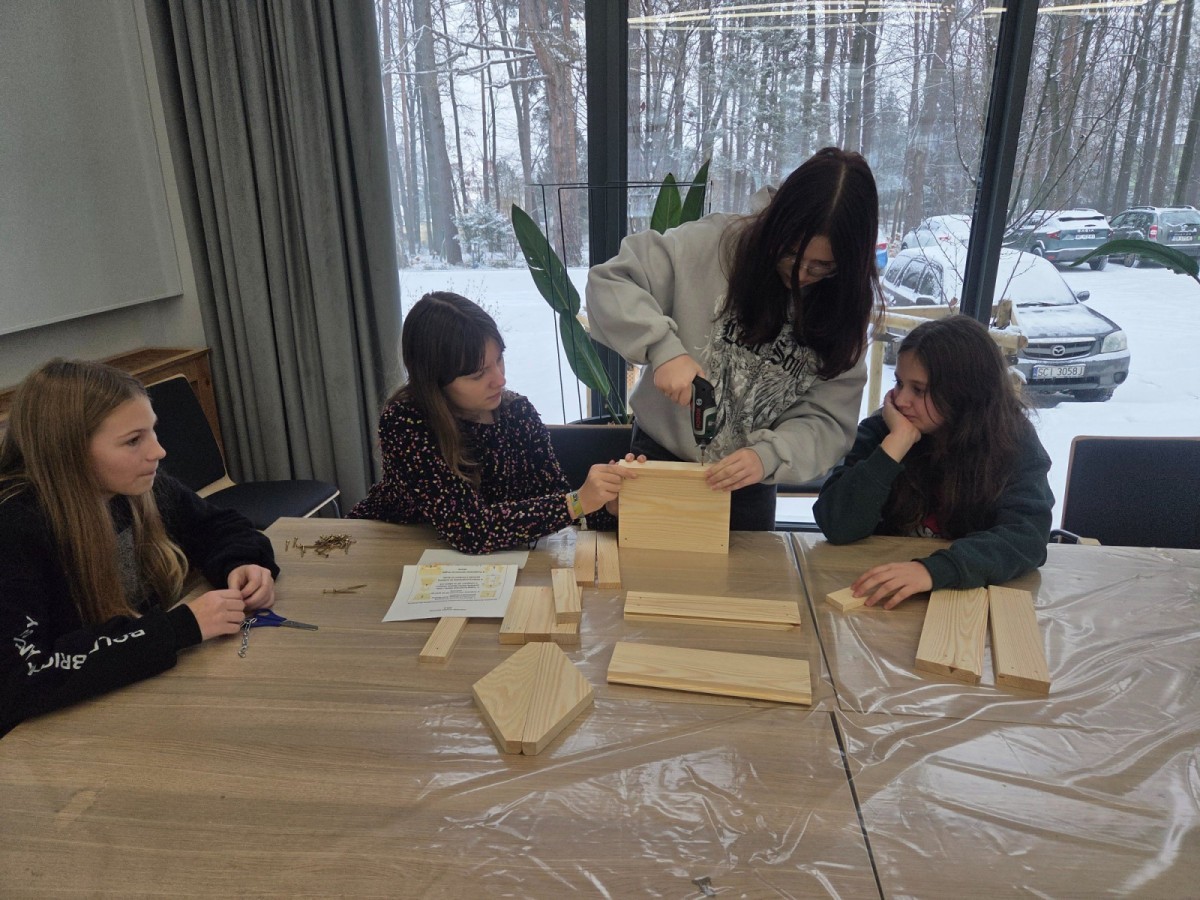 Podczas części teoretycznej uczniowie dowiedzieli się, czym i kiedy dokarmiać ptaki, dlaczego zimą tak ważny jest dla nich dostęp do wody oraz jaką rolę ptaki pełnią w przyrodzie – od regulowania liczby owadów po rozsiewanie nasion. Wiedza szybko zamieniła się w działanie. W części praktycznej uczestnicy wykonywali karmniki, poznali zasady, gdzie i kiedy należy je wieszać, a także uczyli się rozpoznawania ptaków przy pomocy lornetek i lunet.