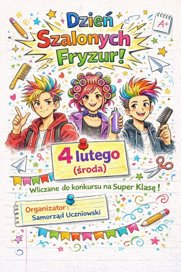 Środa 4 lutego należała natomiast do Szalonych Fryzur. Tego dnia uczniowie pokazali swoją kreatywność i odwagę, prezentując kolorowe i pomysłowe stylizacje włosów. Im bardziej niezwykła fryzura, tym większe uznanie w konkursie na Super Klasę. Ta akcja udowodniła, że zabawa i wyrażanie siebie w szkole mogą iść w parze z integracją między klasami.