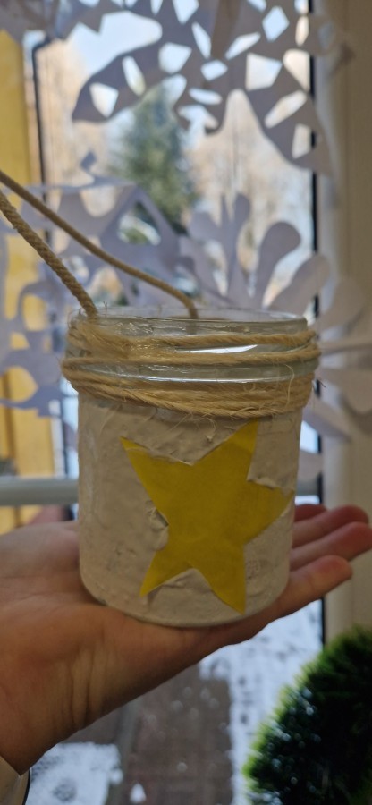 Uczniowie wykorzystali materiały odpadowe słoiczki, sznurki do wykonania lampionu.