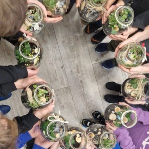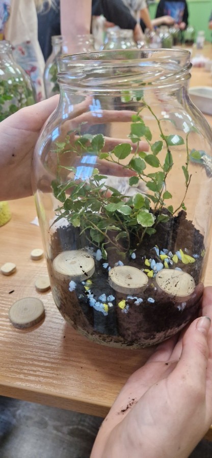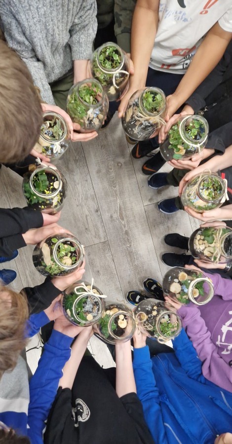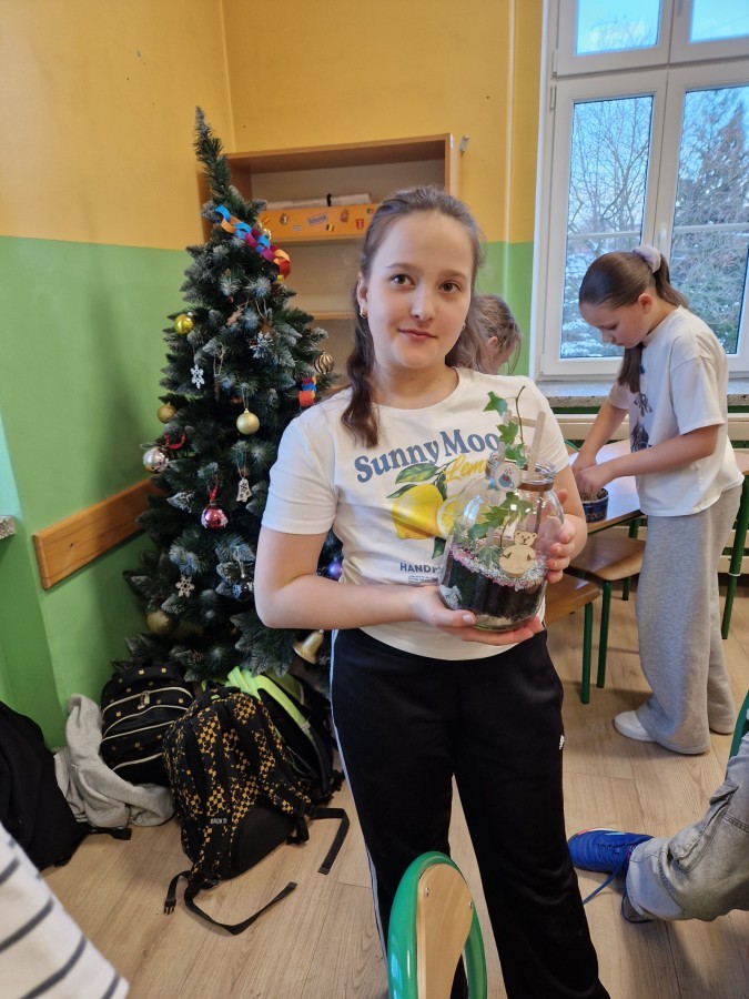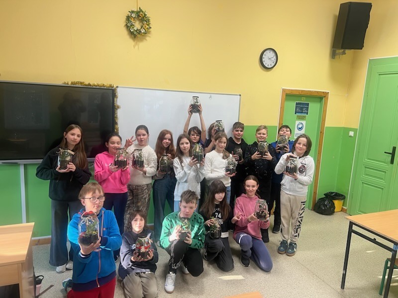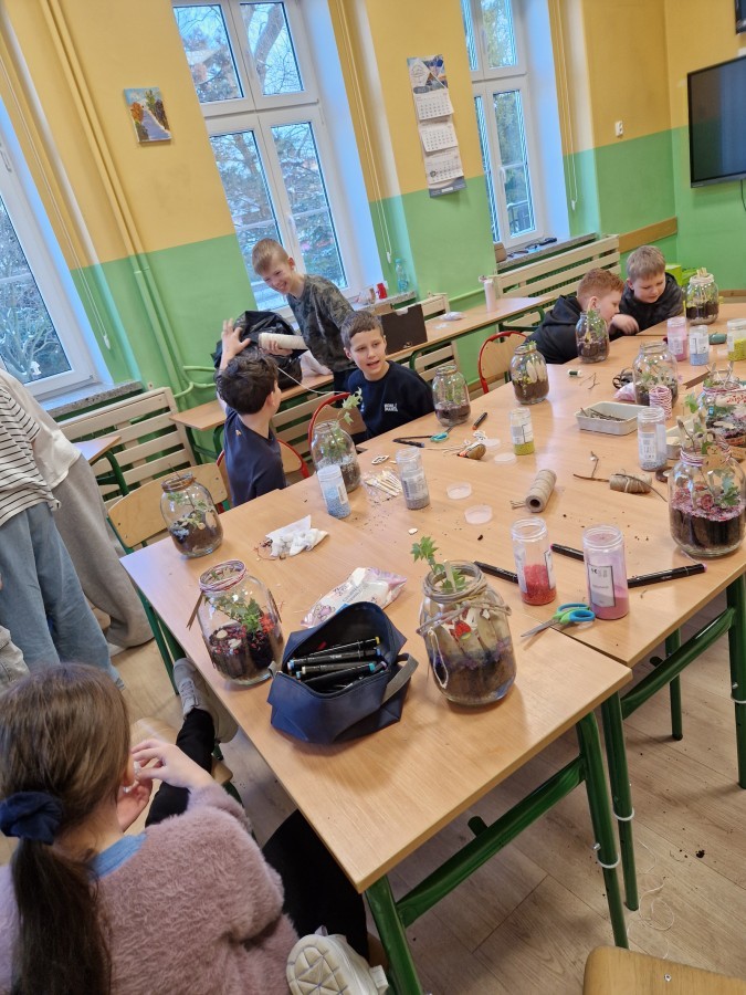 W styczniu w naszej szkole odbyły się warsztaty ekologiczne „Las w słoiku”, w których wzięli udział uczniowie klas 4 i 5. Podczas zajęć mieli okazję stworzyć własne miniaturowe ekosystemy zamknięte w szklanych słoikach. Zajęcia rozpoczęły się krótkim wprowadzeniem na temat funkcjonowanie lasu oraz znaczenia roślin w przyrodzie. Następnie uczestnicy samodzielnie przygotowali swoje kompozycje układając warstwy podłoża, sadząc rośliny i dekorując swoje „lasy”. Warsztaty połączyły naukę z kreatywną zabawą, a uczniowie zdobyli wiedzę na temat obiegu wody w przyrodzie i zasad pielęgnacji roślin.
